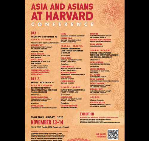 CGIS South CGIS South, 1730 Cambridge St, Cambridge, MA, United StatesHarvard’s enduring engagement with Asia has shaped scholarly inquiry, public policy, and campus life—within the University and across the region. This two-day conference convenes faculty, students, alumni, and institutional partners from across Schools and disciplines to examine the evolving relationship between Harvard and Asia from the late nineteenth century to the present and to consider