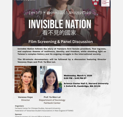 Hall C, Science Center 1 Oxford St., Cambridge, Massachusetts, United StatesSpeaker: Vanessa Hope, DirectorDiscussant: Ya-Wen Lei, Professor, Department of Sociology, Harvard University Invisible Nation follows the story of Taiwan’s first female president, Tsai Ing-wen, and explores themes of resilience, identity,