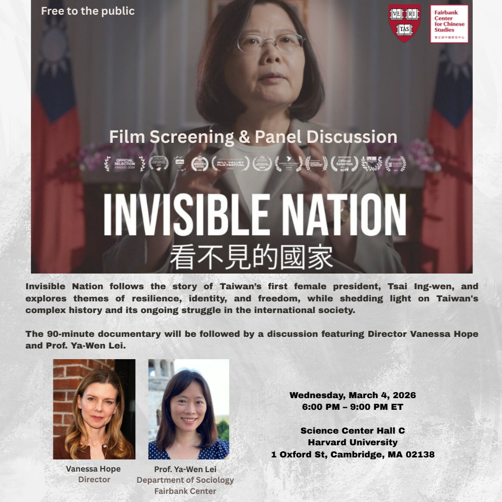 Speaker: Vanessa Hope, DirectorDiscussant: Ya-Wen Lei, Professor, Department of Sociology, Harvard University Invisible Nation follows the story of Taiwan’s first female president, Tsai Ing-wen, and explores themes of resilience, identity, and freedom, while shedding light on Taiwan's complex history and its ongoing struggle in the international society. The 90-minute documentary will be followed by a |