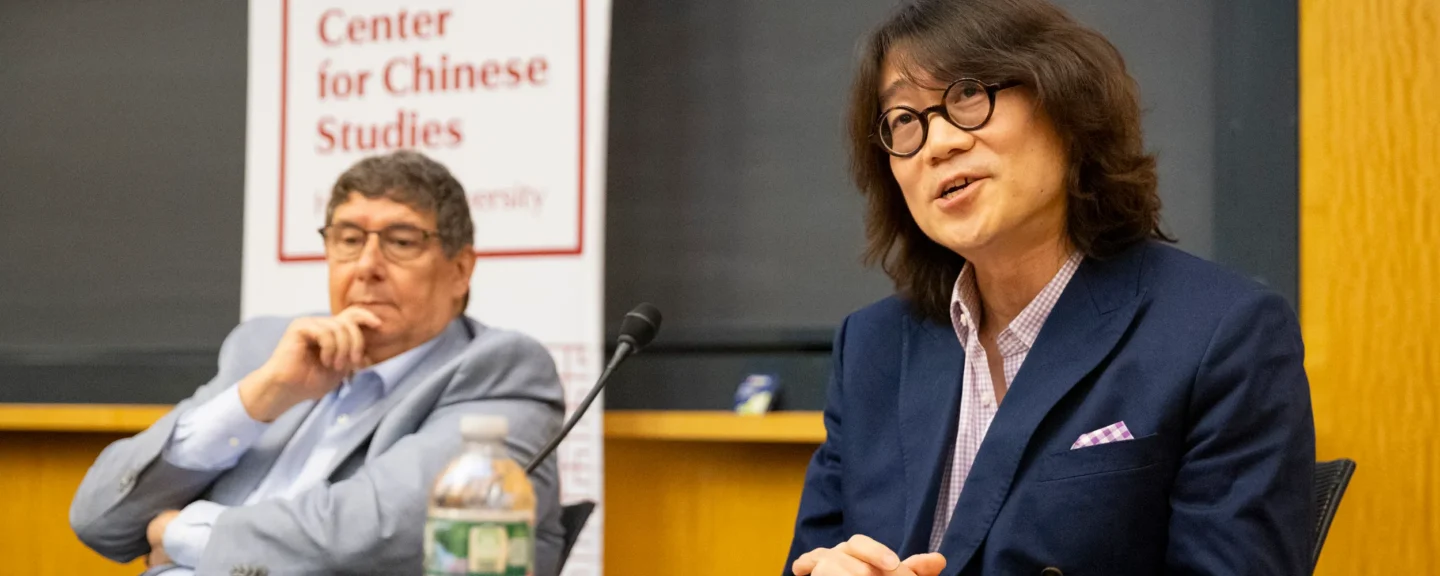 Professors Anthony Saich (left) and Yuhua Wang (right) during the PRC @ 75 symposium. Photo by Niles Singer/Harvard Staff Photographer